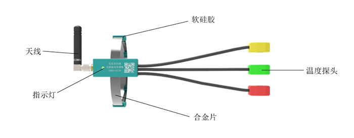 傳感器由傳感器天線(xiàn)、合金片、傳感器主體、溫度探頭四大部分組成。