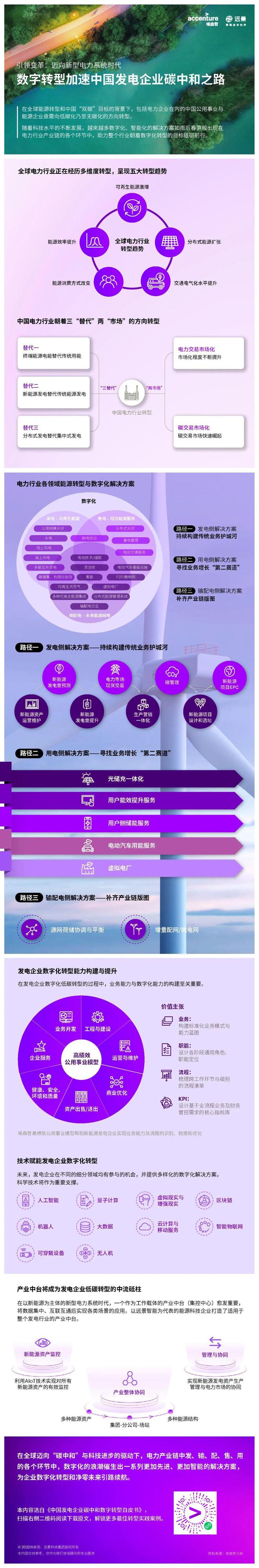 為了應對未來更加“碎片化”的能源系統,滿足消費者日益迭代的需求,埃森哲攜手遠景發布的《中國發電企業碳中和數字轉型白皮書》勾勒了發電企業圍繞發電、輸配電和用電全產業鏈構建轉型路徑,并探討各類數智化解決方案的應用場景。