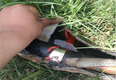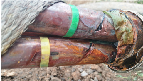 周期放電去聲磁定位,剛開始還能聽到聲音,在精確定位時發現聽不到聲音了,判斷為故障點燒穿,成為低阻故障,所以聲音減小,現場人員告知此處有一接頭,停止放電挖出接頭后發現接頭外觀完好,反復搖晃電纜接頭,繼續打壓,在接頭處聽到微弱放電聲,打開接頭后發現接頭進水。