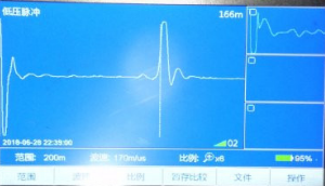根據測試情況選擇黃地打壓,升高電壓至20KV時擊穿放電,用脈沖電流測得故障位置在144米左右。距離對端比較近。